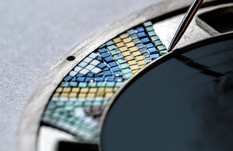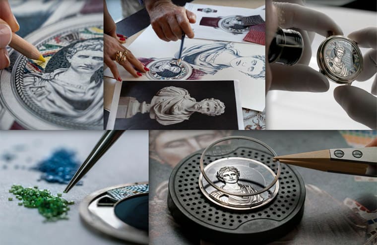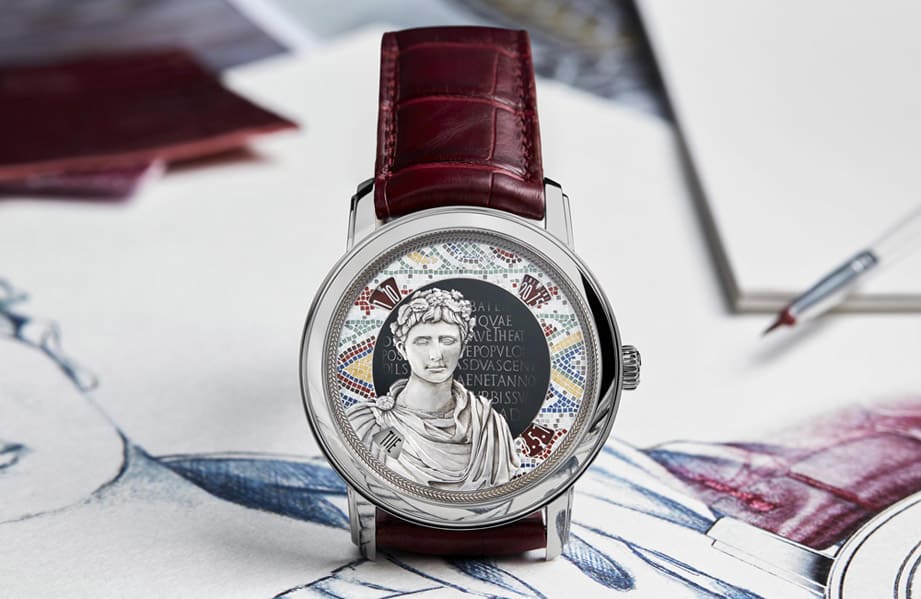 面盘上的金雕镶贴重现了奥古斯都半身像,斗篷悬垂于胸鎧之外,由一只搭扣连接,其褶皱层次与橡树叶头冠箍住的捲髮交相呼应。奥古斯都半身像背后的背景以蓝绿色珐琅装饰,边缘则精心地饰有石质微砌马赛克,不用说这裡的灵感正是来自于四世纪在以色列洛德市发现的着名马赛克装饰,由于在的大明火珐琅面盘摆放马赛克硬石碎片时稍有不慎就要重新烧制珐琅、从头来过,所以工艺师在创作时需要非常专注与小心,别看面盘空间小,但是上头撒上的硬石碎片不少于七种石料,总计有660块之多!从数量不难想见制作过程有多费工。面盘最外圈的白金浮雕採用了线雕技法,其灵感源自另一幅以动物音乐家为主题的马赛克作品,最后在奥古斯都半身像身后的蓝宝石水晶膜上,刻着对Rusicada市(现位于阿尔及利亚斯基克达省)神圣守护者 Genius的拉丁文祷告词。