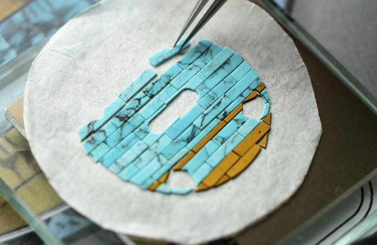 ▲奥古斯都半身像款共用上660颗硬石碎片组成背景马赛克图案。