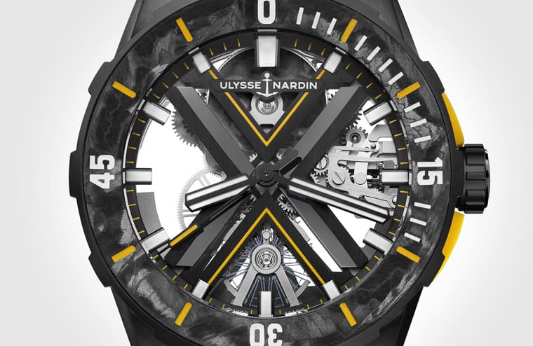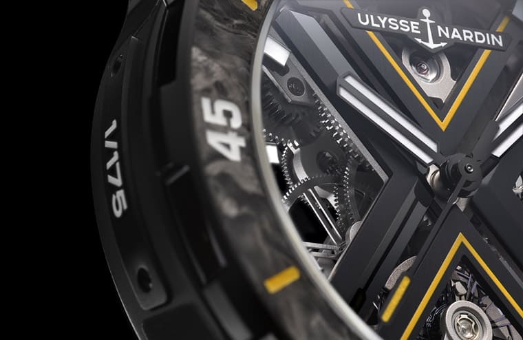 表款搭载的是UN-371自动机芯,这枚机芯本来是应用在Blast系列为主,不过品牌重新修改机芯后移植到Diver X系列上,包括自动盘造型设计成”X”造型,面盘12点方向的发条盒盖板也特别用上与表圈相同的Carbonium®材质展现整体感,而在面盘6点方向还能见到机芯配置的大型硅材质擒纵机构及摆轮,除了确保手表精准走时,也能输出72小时的充足动能,替佩戴者带来满满实用性。