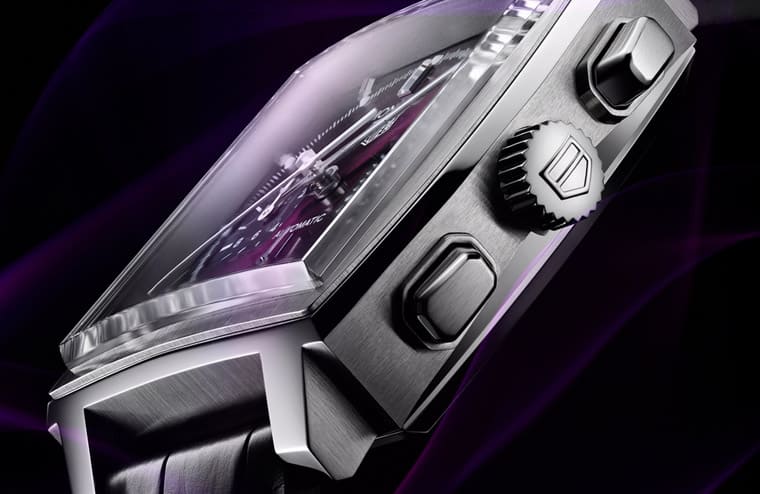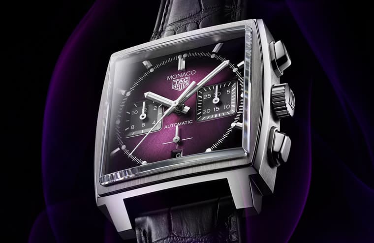 2022年TAG HEUER泰格豪雅打造新款Monaco紫色面盘限量计时码表,除了替经典赛车系列的方形轮廓注入新奇活力,品牌还用限量策略提升手表的收藏魅力。