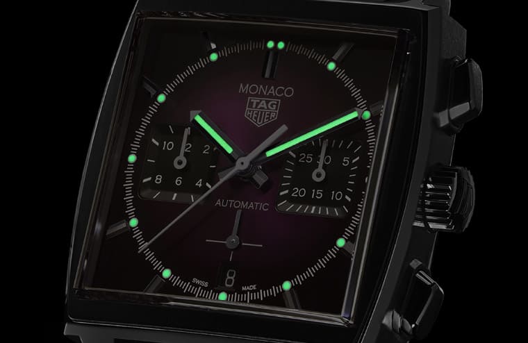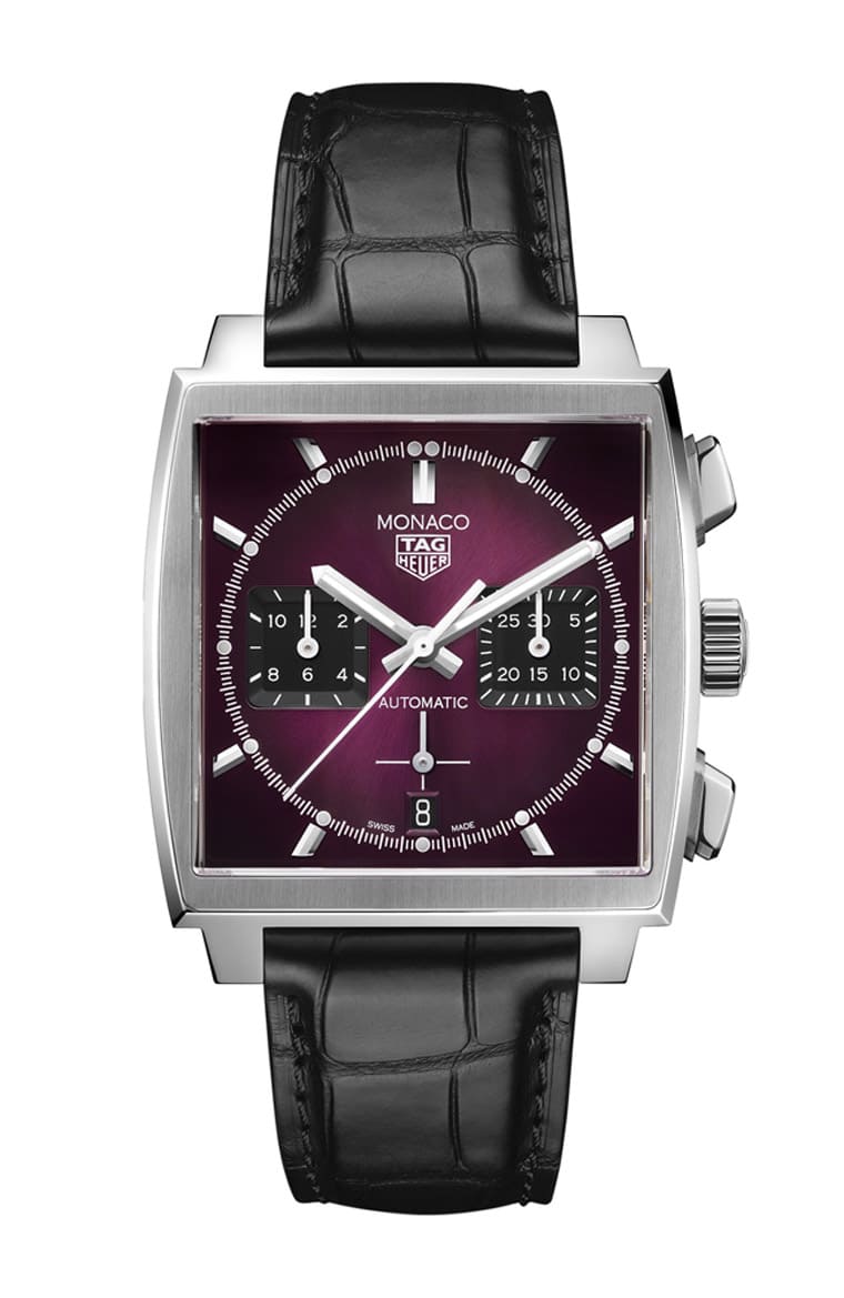 这款全新的Monaco手表,其39mm方形精钢表壳经过磨砂处理表现运动表的刚毅个性,手表别开生面地採用深紫色面盘,其从面盘中央呈现由浅至深的渐层色调,赋予紫色多变的层次感。面盘上的时标与指针皆涂覆白色Super-LumiNova®夜光涂料,至于肩负计时功能的两枚方形小表盘则以黑色蛋白石点缀,以双色调设计强化面盘整体的烟燻质感。