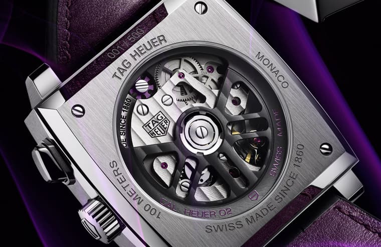 Monaco紫色面盘限量计时码表搭载系列常见的Heuer 02自动上链机芯,这枚机芯本身是圆形设计,放在方形的表壳裡显得尺寸刚好,同样为圆形的透明底盖可见机芯的黑色镂空自动盘,自动盘本身与机芯底板都有日内瓦波纹修饰,且自动盘下缘也呼应面盘顏色将该处的机芯名称、品牌Logo与瑞士制造等字样覆上浅紫色调;甚至连位在12点方向与计时功能息息相关的导柱轮零件也都镀成紫红色,对于细节处理的用心让人对这只限量表的好感度因此更强烈。