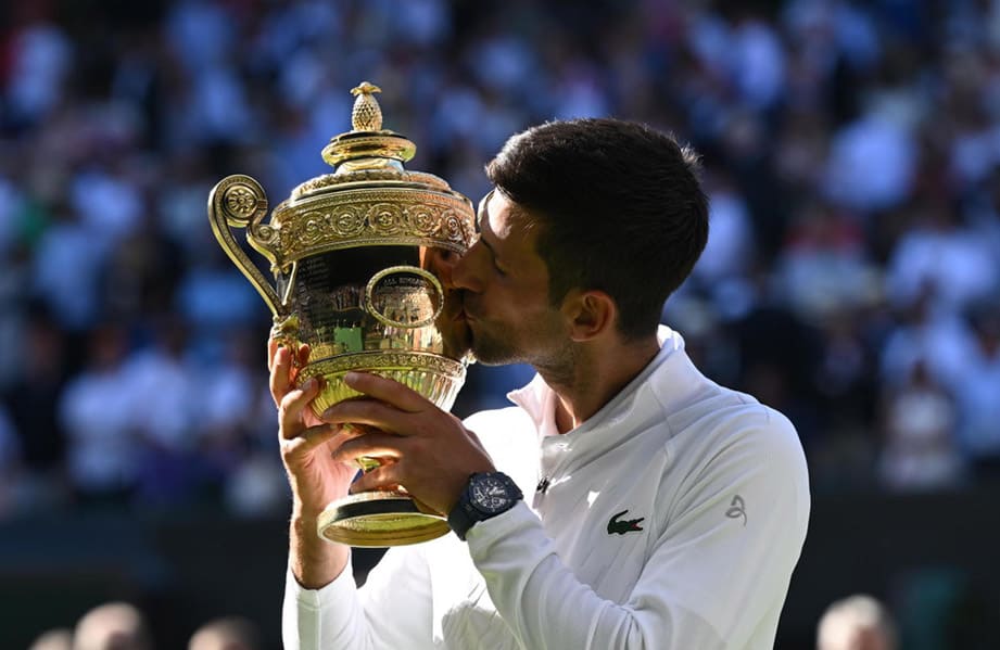 ▲乔科维奇赛后开心地捧起温网奖杯亲吻,手上再度露出他最近的宇舶爱表。Source:Facebook @wimbledon