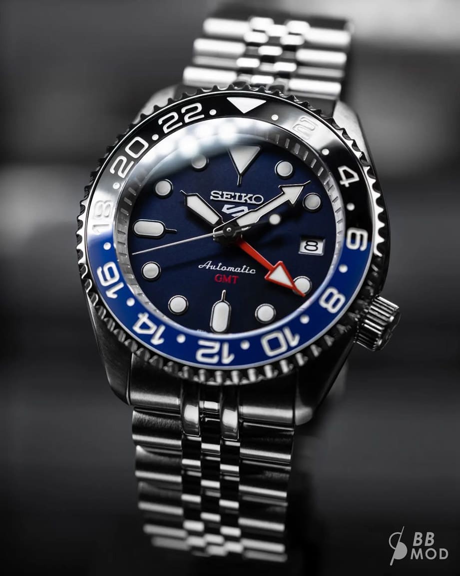 SEIKO的入门机械表系列5 Sports 2022年时新增两地时间款引起不少表友感兴趣,因为手表秉承系列的亲民价格路线,虽然两地时间款式比多数三针款价格稍高,但是一款GMT机械表定价NT$ 13,500怎麼看都是很划算的选择。SEIKO刚开始于此系列新增复杂功能款式或许还在观望市场反应,因此手表目前仅出现三种配色,包括橘面SSK005K1、蓝面SSK003K1和黑面SSK001K1,其中又以蓝面SSK003K1的讨论度最高,因为这款表的表圈是半蓝半黑,加上不锈钢链带又是由5枚錬节组成,乍看还真有几分平民版劳力士GMT-Master II 126710BLNR的味道。