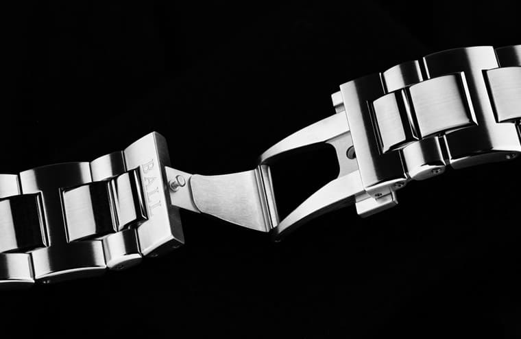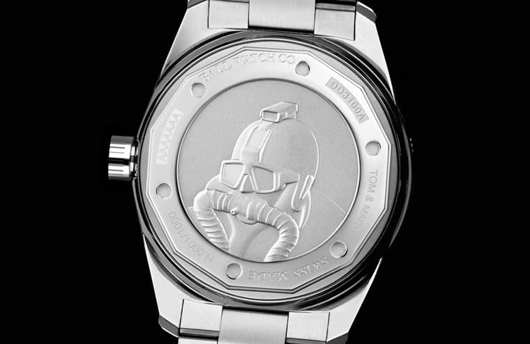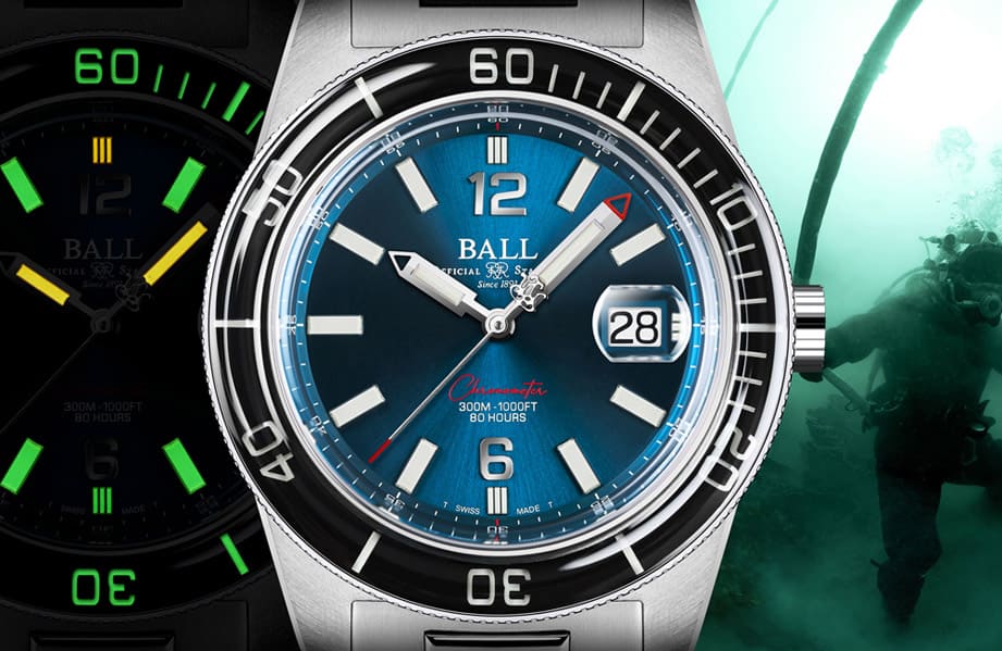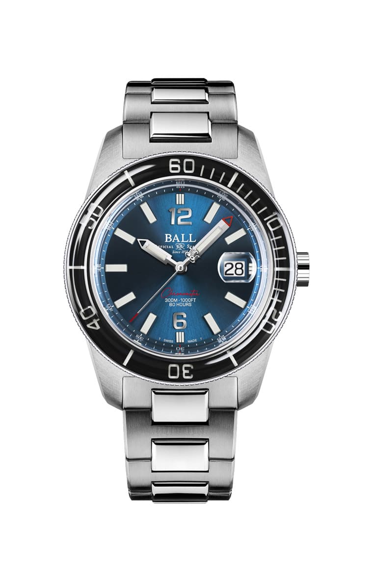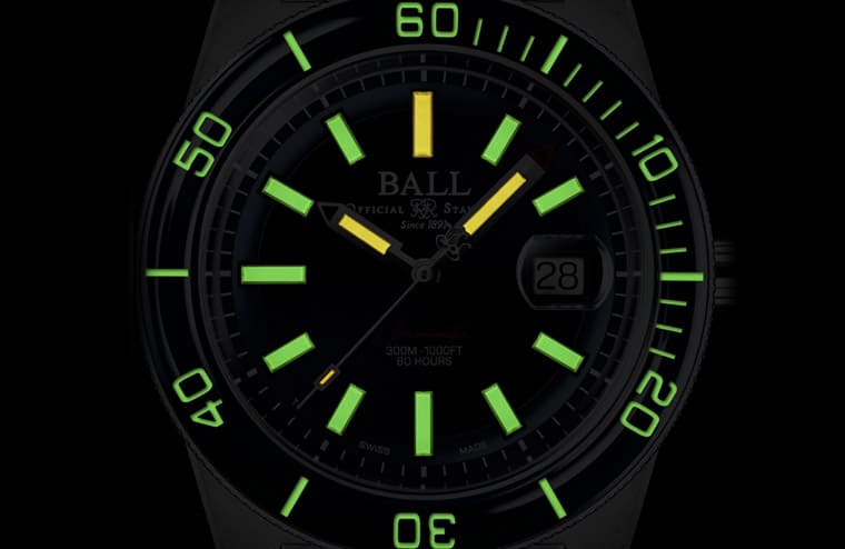 表款採用宝蓝色或深蓝色面盘,其中宝蓝色面盘于12点与6点方向都额外镶有金质阿拉伯数字时标,而深蓝色面盘则统一镶嵌大尺寸的矩形自体发光微型气灯——每枚气灯宽达1mm,搭配指针上额外镶有较细的气灯,其中12点方向时标、时、分指针的夜光效果为黄色、其他时标与表圈上的刻度夜光效果则皆为绿色,强大的夜视效果让佩戴者即使置身伸手不见五指的水下环境,也能清楚判读预计上岸时间。而在面盘其他设计元素方面,BALL WATCH于3点方向设置放大日期显示,同时分针和秒针的针间都涂上红色,以上这些设计巧思都有助于阅读当前时刻,展现品牌注重手表机能性的创作观。