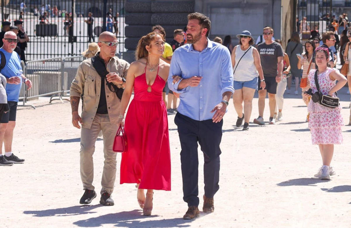 提到班艾佛列克与珍妮佛罗培兹这对新婚夫妻,他们最近飞往巴黎度蜜月顺便替女方庆生,双方一起共进浪漫午餐并开心血拼高调放闪,两人漫步在罗浮宫外愜意散步,这当然也引起了外媒争相抢拍。这天J. Lo身穿桃红色的连衣裙、脚踩裸色厚底高跟鞋,身上的配饰也是戴好戴满如耳环、金项链与手环等等,手上也提了个与连衣裙同色地的方型包。