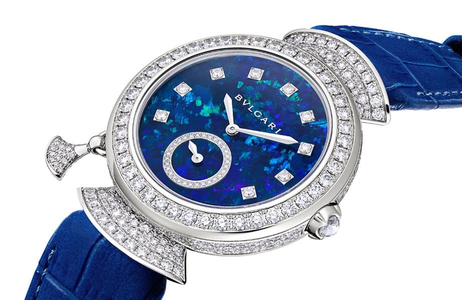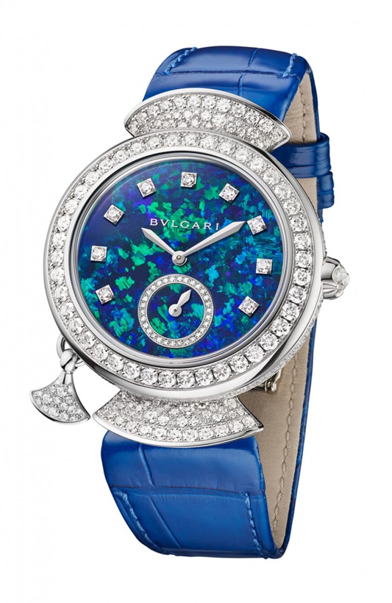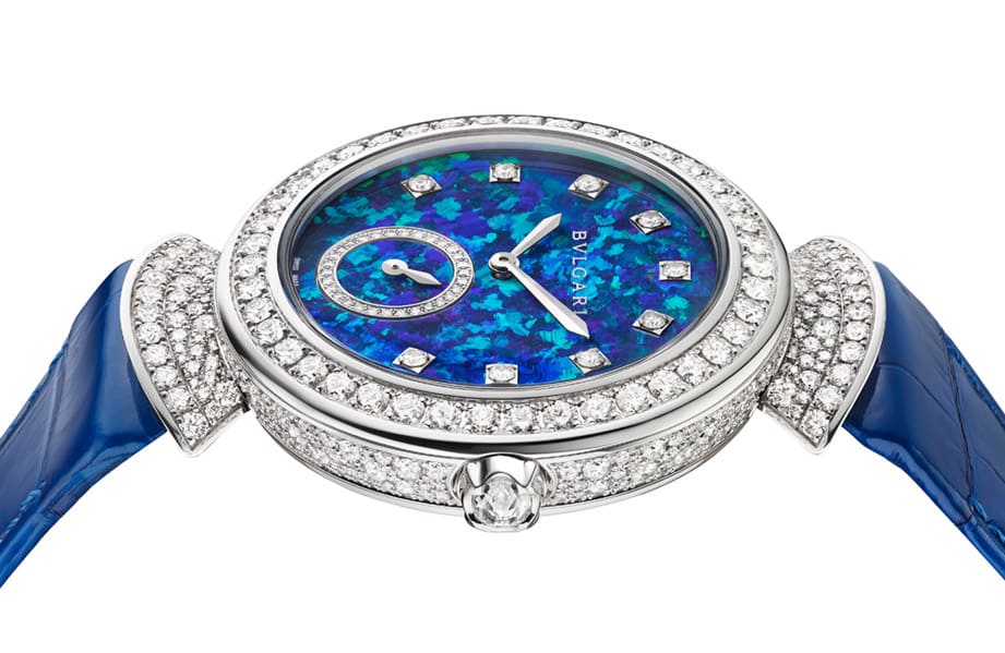 表款外观共镶嵌超过360颗美钻,搭配蓝色鱷鱼皮表带形塑优雅兼具独立个性的风格,宝格丽还专程替手表选用蛋白石作为面盘材质,透过蛋白石本身迷幻多变的色彩,除了呼应表带的蓝色调,还能替手表增添丰富的视觉魅力,搭配镶钻时标以及6点方向小秒盘的钻石边框等,使基本显时功能看起来简约却不简单。