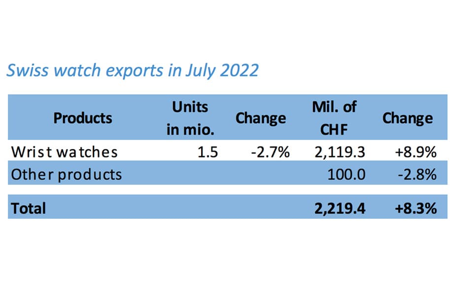 ▲瑞士钟表工业联合会最新统计出口资料,可见2022年7月份其出口额比起去年同期增加8.3%。Source:FH