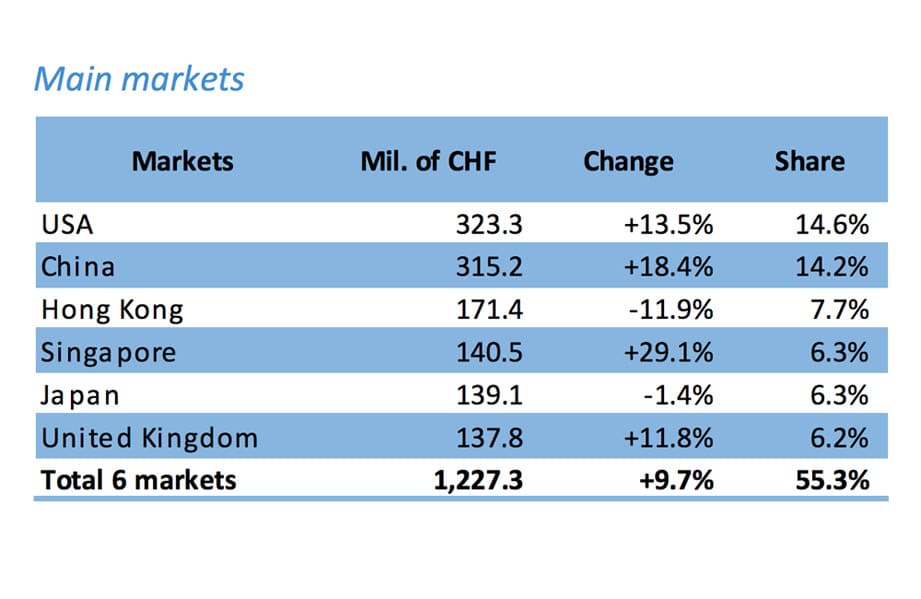 ▲美国目前稳佔瑞士手表第一大出口市场,亚洲国家则是囊括2~5名。Source:FH