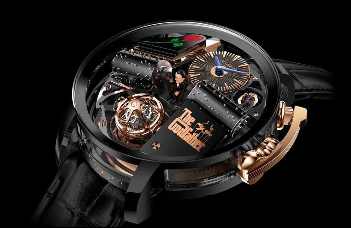 至于这次品牌捐给Luisaviaroma x Unicef慈善晚的Opera Godfather特别版又和一般版有点不同,JACOB & CO.将电影中的剧院海报、布景、服装和整体叙事元素都融入了作品设计中,例如电影主角唐·柯里昂女儿婚礼上佩戴的玫瑰、让人联想起与操纵、背叛等负面氛围有关的戏偶线,同时表冠也设计成如同小提琴的造型,呼应手表的音乐盒装置,此外面盘中央还镶有一尊唐·柯里昂的Q版金雕人偶,让手表散发强烈的主题性。针对Luisaviaroma来自义大利的背景,JACOB & CO.选用这款表刚好可以强调义大利血统,也让当晚参与竞标的收藏家,尤其是义大利收藏家对这款表产生浓厚兴趣。