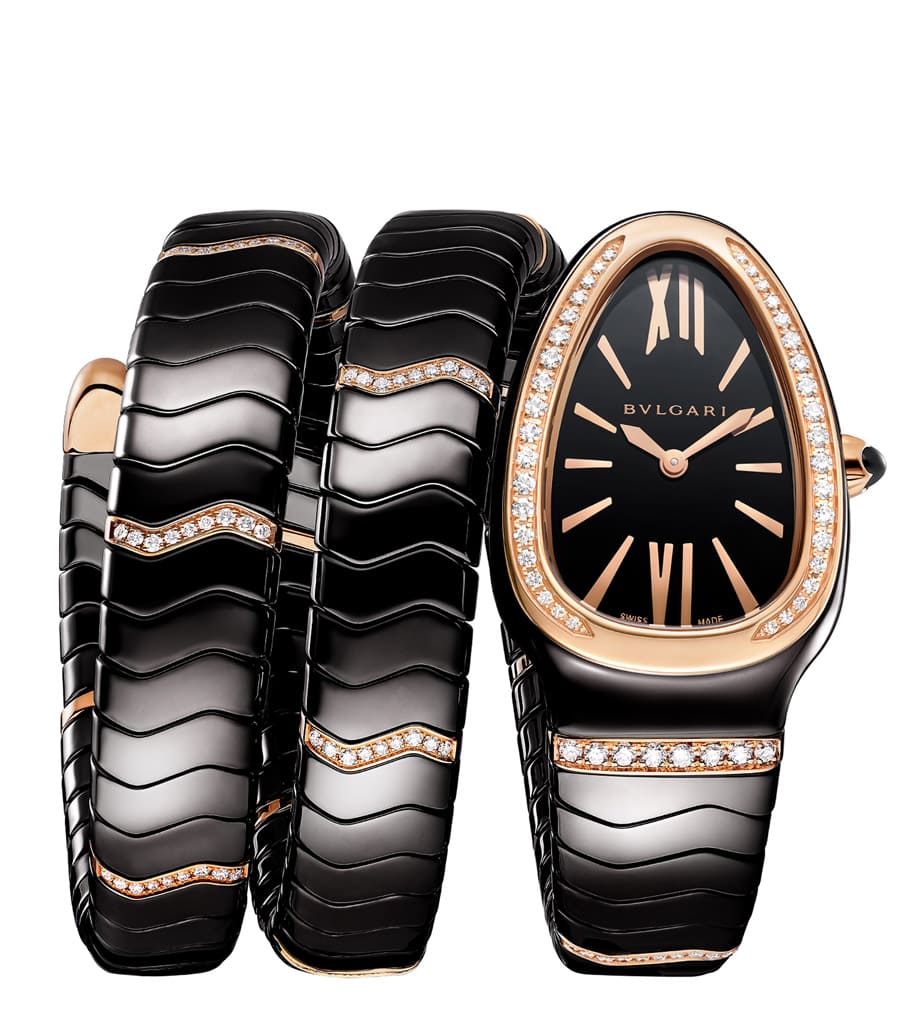 还有一款Serpenti Spiga陶瓷表表壳尺寸35mm,加上链带与表圈分别用陶瓷与黄金材质制成,其中黑色陶瓷链带的连结採用复杂的Tubogas金匠技术打造,链带上更镶饰总重约1克拉的152颗钻石,包括表圈也镶上38颗美钻,让低调的黑陶瓷壳与链带散发尊贵大器感。
