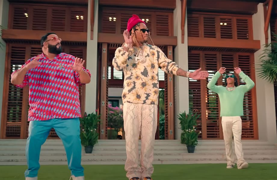 皇家橡树霜金镂空双摆轮手表是AP 2021年发表的作品,这款表拥有品牌特色的双摆轮设计、镂空机芯,表圈镶上矩形切割沙弗莱石、祖母绿、黄玉、坦桑石、紫水晶和彩色蓝宝石等32颗彩色宝石,表壳更用上了佛罗伦斯锤击技术制成的「霜金」表壳,让手表无论内外在都发出绚丽光芒。DJ Khaled在MV中数次露出这款表,甚至还会特别把镜头带到手表身上,同时Lil Baby和Future在MV中也像是说好了一样都佩戴爱彼手表,虽然他们的手表也都是钻石镶好镶满,但是论抢眼程度,DJ Khaled心仪的皇家橡树霜金镂空双摆轮手表似乎还是略胜一筹。