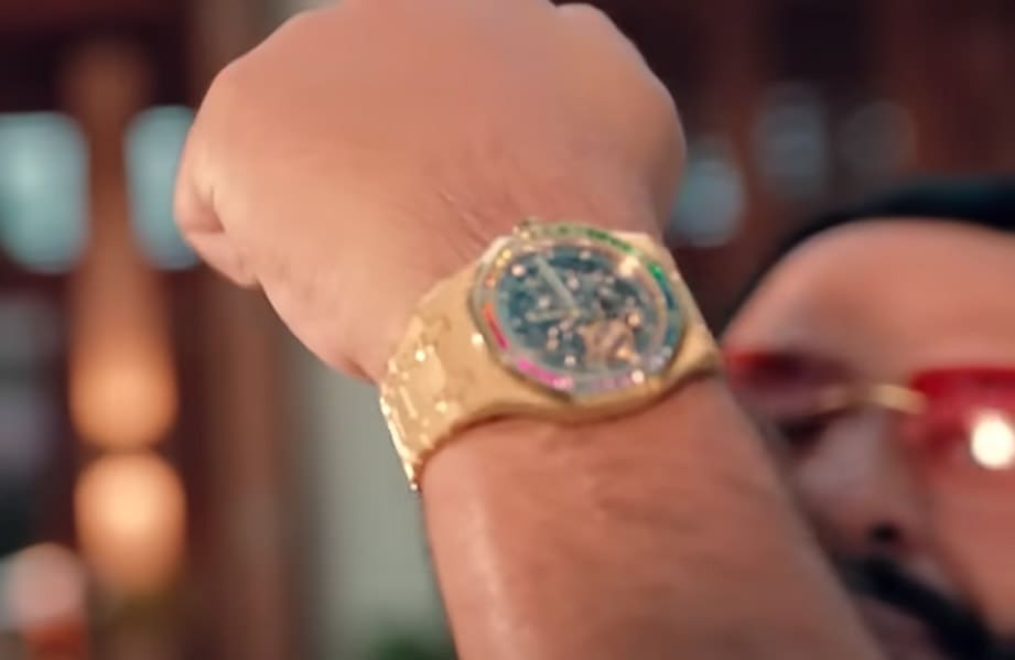 ▲DJ卡利不仅在歌词中提到爱彼的皇家橡树霜金镂空双摆轮手表,在MV中也不断秀出手表本尊。Source:翻摄自Youtube