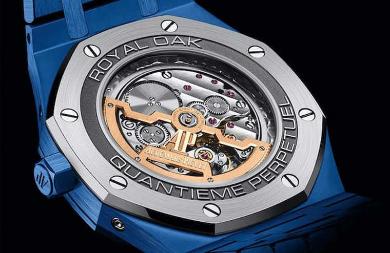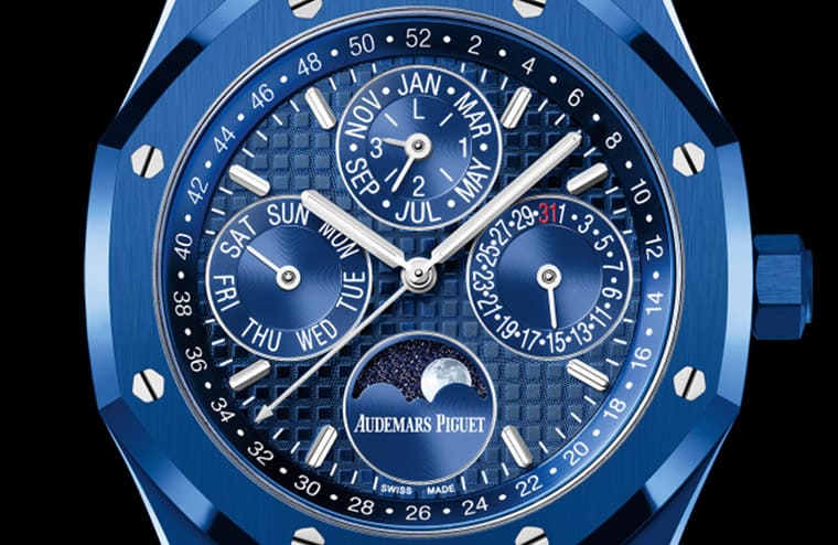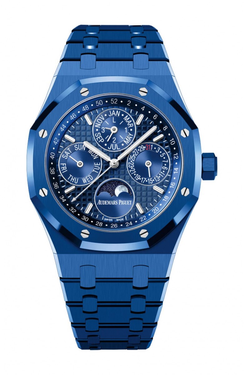 ▲AP新款皇家橡树万年历开启品牌先例採用蓝色陶瓷制作表壳与链带,继黑色和白色陶瓷后,再度让人见识到品牌制作陶瓷壳的工艺魅力。