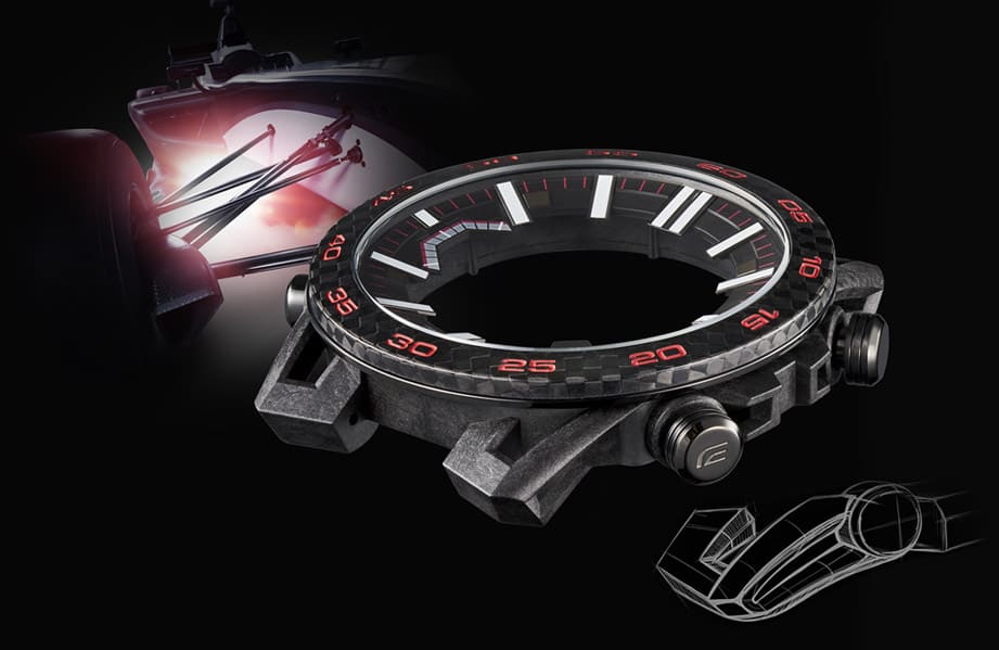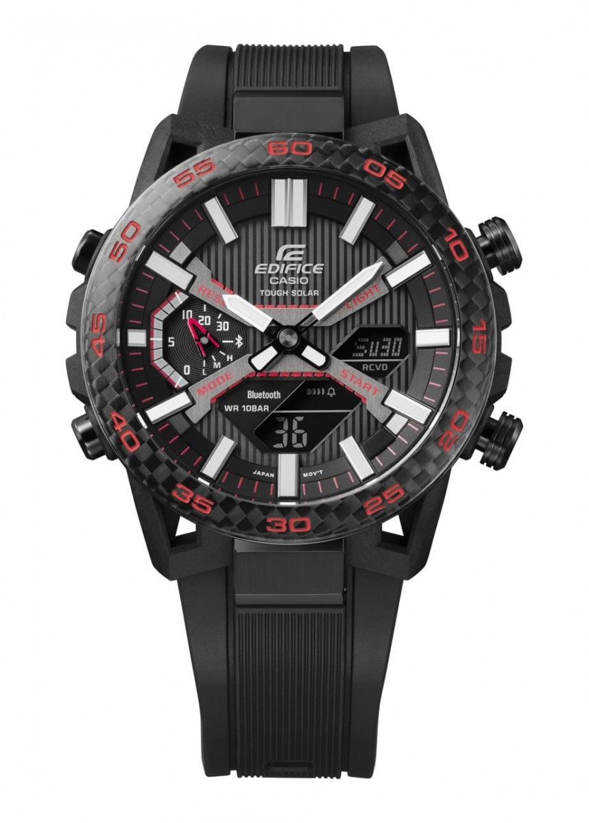 ECB-2000为卡西欧首度应用碳纤维强化树脂表壳的EDIFICE手表,其外观的特色如碳纤维强化树脂表耳以四臂排列配置,镂空的表耳结构由表壳延伸至表带,散发出浓浓的赛车竞速风格。其中三个版本中最富动感精神的ECB-2000PB採黑红配色,它的黑色树脂表带具备轮胎防滑纹设计,甚至表圈也採用和赛车界关系密切的碳纤维材质,整体色调让人一见就热血沸腾。