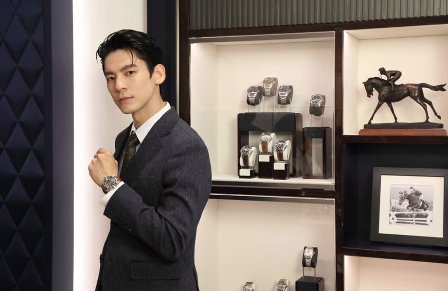 ▲林柏宏一身蓝色西装并佩戴浪琴表先行者系列世界时区手表,展现优雅绅士风范。