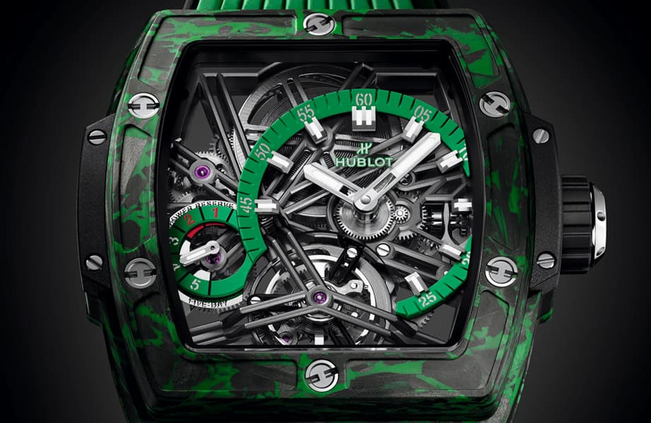 Spirit of Big Bang系列为宇舶旗下唯一的酒桶形手表,它的外观与大爆炸系列同样以6颗H型螺丝固定表圈,并且表壳结构一样由层层堆叠的三明治设计组成。原本系列的造型就已经很有辨识度,在宇舶导入绿色复合物的碳纤维材质后,与手表既有的黑色和金属本色和谐相容,且品牌也特地在镂空面盘的偏心表盘与动力储存显示等处换上绿色的刻度环,使得镂空机芯也能够拥有和表壳与表带呼应的绿色,营造出令人难忘的亮丽外型,跳脱传统高阶运动表的顏色形象,转而呈现潮酷摩登性格。