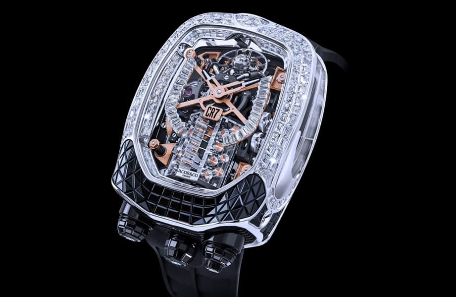 JACOB & CO.在2022年初时受C罗委託专程打造出这款奠基于Bugatti Chiron手表的个人专属手表,钛金属表壳由232颗矩形钻石和109颗黑色蓝宝石覆盖,总重21克拉,同时在面盘特色的仿真W16引擎装置上还镶有代表这位葡萄牙巨星个人的”CR7”金属名牌,这使得手表不仅复杂华丽,同时也只有C罗拥有这独一无二的订制版,戴出门完全不用担心会撞表。