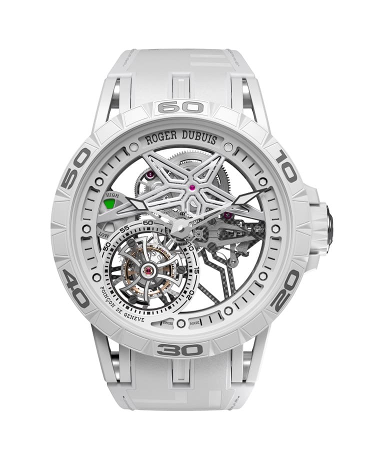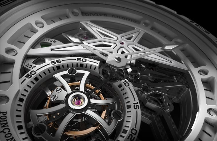 表款搭载镂空机芯展现通透视觉效果,其中机芯桥板蕴含罗杰杜彼经典的星形造型元素,设置于面盘7点位置的是复杂的陀飞轮装置,它既是表款最重要的特徵,也靠着自转不息的动态强力吸引观者目光。Excalibur Spider PIRELLI单陀飞轮受到赛车世界的启发,因此在9点位置配备了形似汽车油表的动力储存显示,佩戴者可从中了解到60小时动力的消长情况。表款的内外零件,包含陀飞轮在内都通过高级钟表界最严谨的品质认证之一的「日内瓦印记」检测确保品质达到业界一流水准。