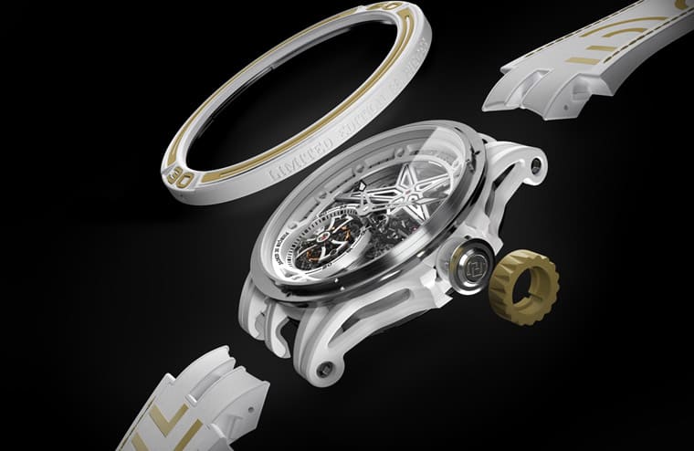 Excalibur Spider PIRELLI单陀飞轮以纯白色MCF矿物复合纤维打造45mm大尺寸表壳,这种材质过往在Excalibur系列便曾出现过,它的主要成份为二氧化硅,经由SMC片状模塑工序制成,比传统SMC片状模塑碳纤维轻13%,有助于增进佩戴舒适度,同时也能提供手表足够的保护性。与表壳顏色呼应的还有白色橡胶表带,内部嵌衬白色橡胶,并饰有填充SLN夜光涂料的倍耐力150周年纪念标志和白色缝线,以与印象中轮胎色调截然不同的白色诠释PIRELLI联名手表,罗杰杜彼勇于开创新风格的个性在此再次获得验证。值得注意的是,全白色调也是第一次出现在Excalibur Spider PIRELLI系列作品中,以全新气象做为倍耐力周年纪念的献礼。
