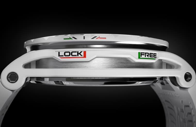 ▲表侧有”LOCK”和”FREE”字样,使佩戴者明白如何将表圈拆装至定位。
