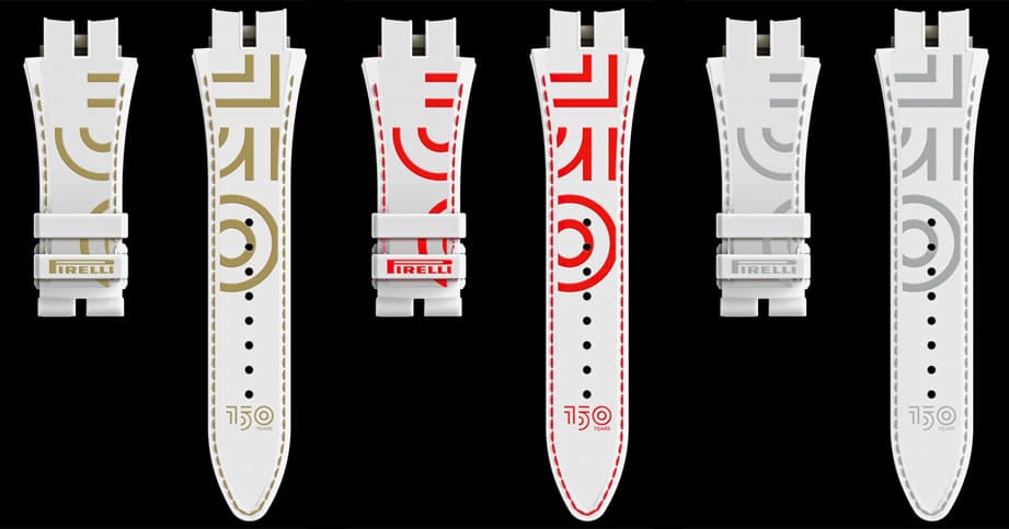 罗杰杜彼参考倍耐力150周年纪念採用的三个官方主视觉顏色,包含金色、银色和红色,打造出三组套件,其中包含表带、表圈与表冠零件,表带部分饰以倍耐力标志性的独特曲线,让表主可以灵活又时尚地更换套件,赋予手表兼顾多元搭配性的独特纪念意义。