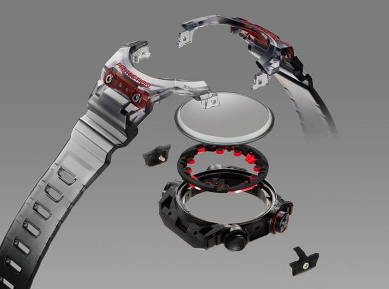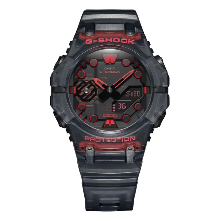 此系列的设计理念为通往虚拟实境大门,所以手表外观会让人有一种未来科技感,例如面盘融入许多几何元素,9点钟位置表眼设计为门板样式并搭配INFO功能。GA-B001引用G-SHOCK经典黑色与品牌新研发的高饱和度红色示人,至于GA-B001G型号则是在表圈和表带的半透明材料採用喷墨印刷创造渐层色彩,象徵现实与虚拟世界的联系,因此GA-B001G更能与系列的创作理念契合,只不过伴随更令人惊艳的视觉效果与额外的制作工序,表示GA-B001G的定价也会相对高一些,入手前可以先注意到这些细节、型号与价格的差异再做决定。