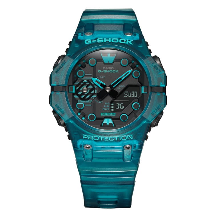 ▲GA-B001G型号启用创新的喷墨渐层表带,搭配表壳的半透明外观相得益彰。