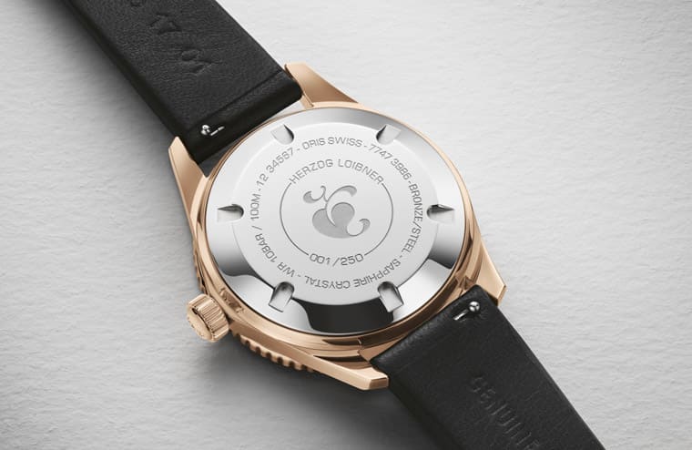 Herzog Loibner Edition的面盘为棕色放射渐层色调,这种顏色过去和青铜表壳搭配无往不利,搭配Divers SixtyFive系列的复古调性再适合不过,面盘格局为基础的大三针,6点方向开设日期窗提升手表的实用性。翻到表背可以注意到不锈钢底盖(异材质的使用乃是出于降低皮肤过敏的考量)鐫刻有Herzog Loibner标志图腾”Aldusblatt”这种象徵爱情和友谊的心形Aldus叶子,表现与一般Divers SixtyFive底盖有别的特殊身份,Aldusblatt图腾周围还刻有手表的限量编号,本款仅发行250只,是数量相对稀有的ORIS手表。