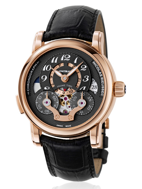 万宝龙自家Caliber MB R210自动上鍊计时机芯, 18K红金表壳, 表冠镶珍珠贝母万宝龙星形标誌, 炭灰色表盘,白色阿拉伯数字,机刻麦粒花纹叶形时分针有夜光涂层处理, 黑色鱷鱼皮表带及18K红金双重摺叠式表扣