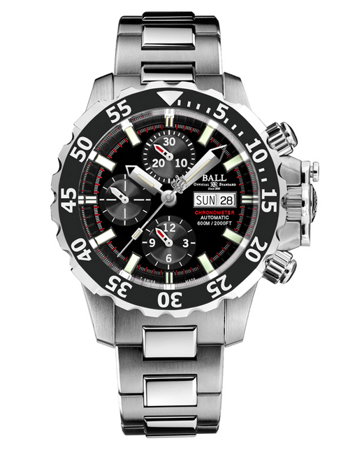 品牌全新专利註册技术,将自动氦排放阀直接置入表冠内(如图),是制表史上首创,避免表面在水压影响下而变形,提高计时码表的防水能力。表冠配备专利註册的上锁保护系统。手表内藏标准的计时码表机芯– ETA 7750自动机芯,可以累积计时至12小时。机芯经过瑞士天文台认证,确保时、分、秒、星期和日期显示精准无误。表盘的刻度和指针均镶嵌3H自体发光微型气灯,即使身处完全黑暗的水底,读时亦一样清晰明亮,本款附赠精美表盒。即日起至10月底止凡购买BALL WATCH 任一表款即赠知名品牌Nalgene夜光水壶一个,数量有限,送完为止! 欢迎电洽全省BALL WATCH经销商或台湾波尔表(股)公司02-27190819 。