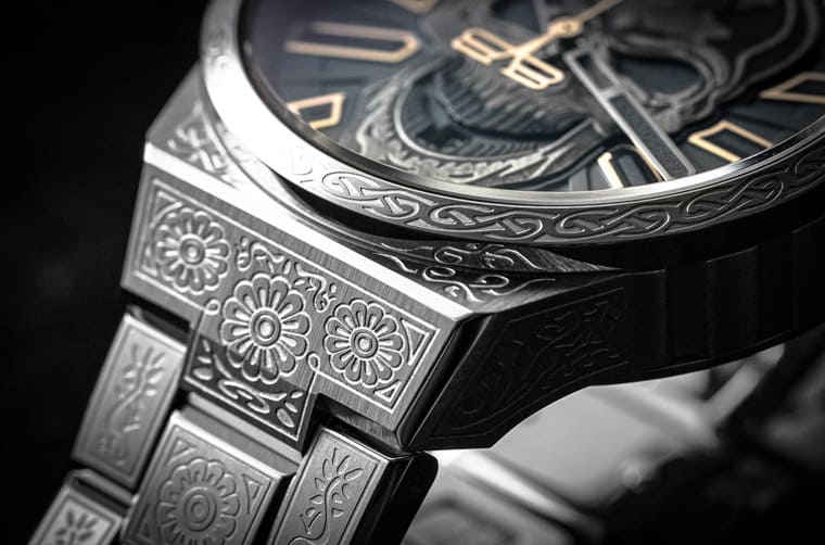 Bolt-68 NEO系列十周年纪念骷髏机械表系列分别有三种版本,首先看到的银色版本选用不锈钢钢材料与坚持瑞士制造的工艺,金属表壳、链带上鐫刻以玛雅生命之树Yaxche为灵感的独特图腾,直接传递设计意义。面盘布局风格强烈的浮雕骷髏则是炸弹表极有特色的标志图腾,搭配Super-Luminova夜光涂料,使手表在光线昏暗时也能保有清晰的判读性。