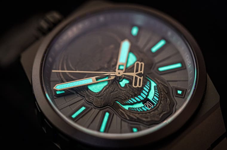 同款还有消光黑版本,其以消光黑色不锈钢材质表现出神祕情怀,採用蓝宝石水晶镜面、表冠设置在12点方向,并带有炸弹表标志性的秒针,这些元素都是品牌表款的共同特徵。手表面盘具备独特的黑色骷髏浮雕图腾,眼睛、牙齿、时标与指针则涂布Super-Luminova夜光涂层,在暗处散发一股神祕酷炫感。
