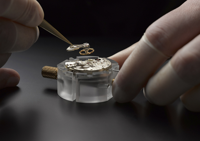 摆轮夹板上的雕刻就如指纹一样,使每枚朗格手表独一无二。雕刻大师在细小部件上手绘出花卉图案。具有横向微米螺丝的鹅颈式槓桿,是机芯的另一典型特徵。此装置可精确调校手表的振幅。