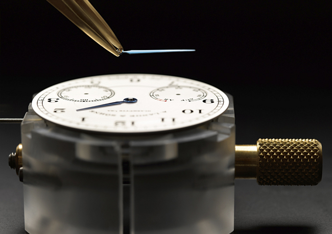 在最后的组装过程中,第一颗固定螺丝会被完美无瑕的蓝钢螺丝所取代。把螺丝慢慢加热至摄氏约300度,此螺丝便会呈现出现独特色调。这个过程令钢面盖上一层极薄的磁铁矿(Fe3O4),矢车菊蓝色光泽则因干扰现象而形成。相对嵌于其中的拋光黄金套筒和红宝石轴承,蓝钢螺丝在德国银夹板和桥板上显然格外瞩目。