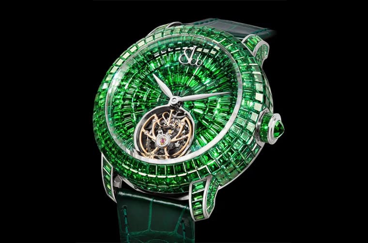 ▲JACOB & CO. Caviar Flying Tourbillon “Tsavorites”採用300多颗沙弗莱石镶嵌在表壳与面盘上,搭配手表具备的飞行陀飞轮装置,视觉效果超强。