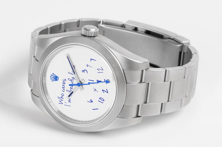 手表既然名为“Who Cares”,从面盘上的趣味字句可以尽窥精妙,MAD Paris与Colette在面盘上半部印上”Who cares. I’m already late.”(管他的,反正我已经迟到了),面盘下半部则散落着像是手写上去的阿拉伯数字,想必那原本应该是手表的时标,但因为设计主题是一位已经自暴自弃的上班族(误),所以手表上的时间已经不重要。