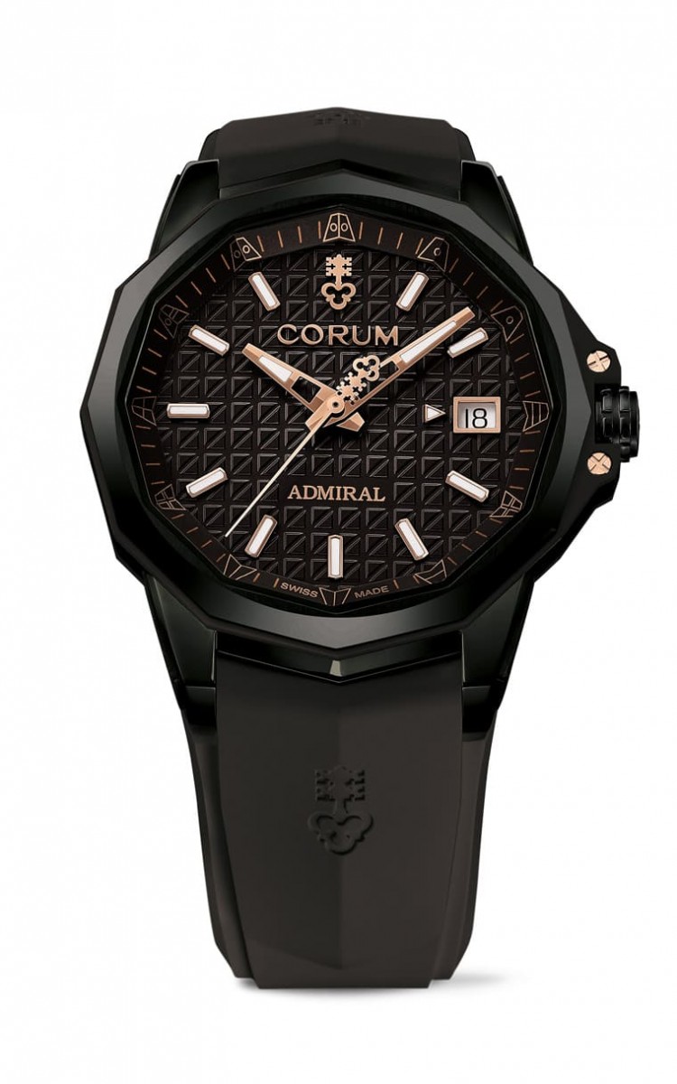 Admiral海军上将38 Black Unisex自动表採用黑色PVD 5级钛金属打造经典的12边形表壳,品牌替手表搭配黑色橡胶表带,表带印上代表昆仑表的钥匙标志,其轻盈不吸汗的特性也很适合佩戴从事休閒运动。
