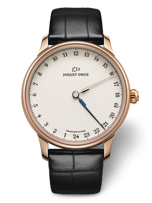 雅克德罗以全新经典之作——两地时24小时(Grande Heure GMT)手表重新詮译奢华时间。简约纯粹、经典雋永、弥足珍贵,两地时24小时(Grande Heure GMT)向其缔造者的绵邈旅跡致敬 。这款新颖别致的表款完美契合当今环球旅行者及美学家的要求,佩戴者可轻鬆读取两地时间。大明火珐琅“Grand Feu”表盘上设置24个阿拉伯数字时标,令两地光阴的荏苒流转随时随刻一览无餘。