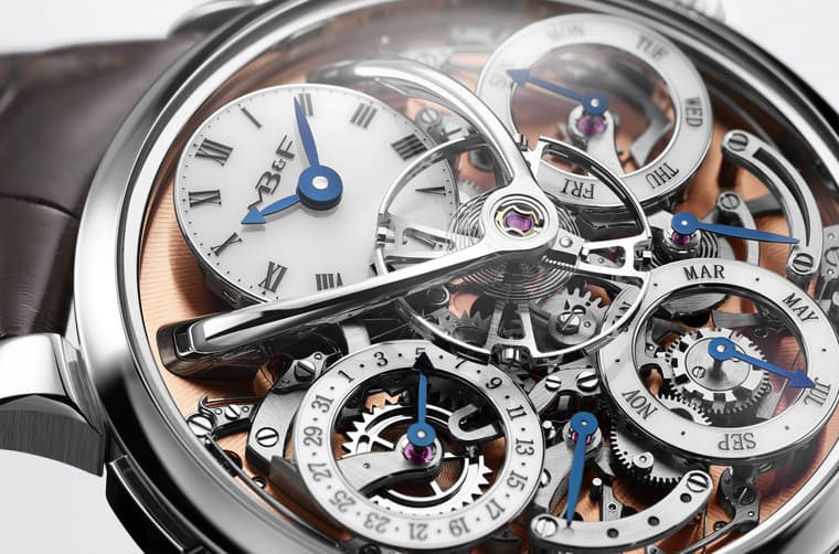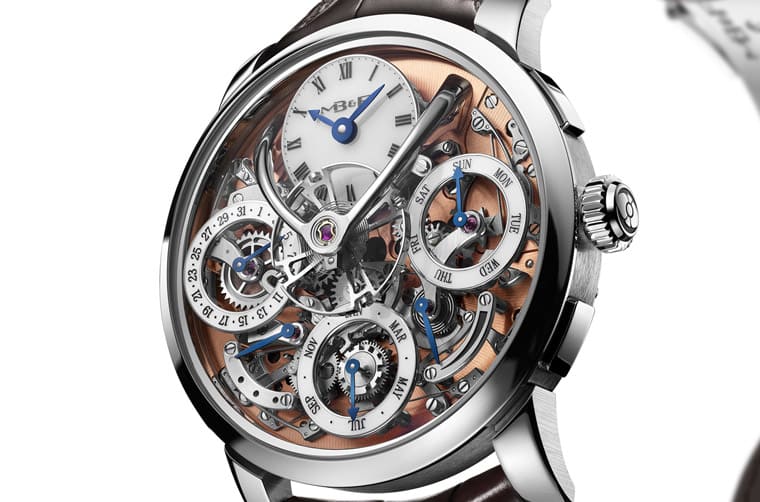 表背可见手表搭载手动上链机芯的细腻样貌,这枚机芯蕴含581枚零件,它是MB&F从头擘画的作品,并非在基础机芯上加装万年历模组延伸而得。Maximilian Büsser对于传统万年历手表常在不对的时机点卡住、堵滞、损坏或跳过日期感到不甚满意,这促使MB&F捨弃传统万年历常採用的Grand Levier系统,转而研发出新式的「机械处理机制」,其与Grand Levier系统万年历预设每个月份为31天的周期不同,而是将每个月份天数预设为28天,此机制可以确保每个月都会显示实际的天数,不会「跳过」多餘天数,进而避免日期出现跳转错误的情况。