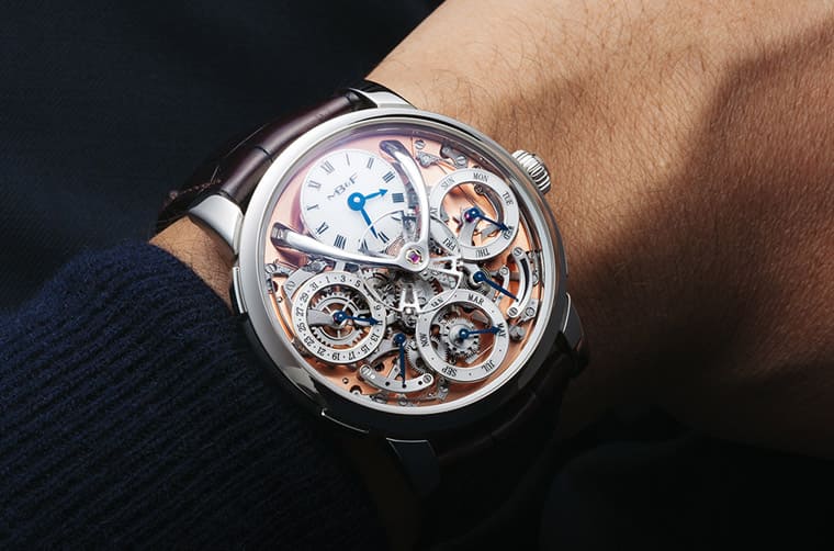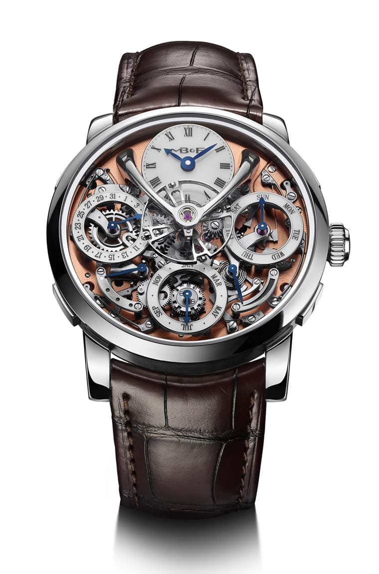 MB&F的Legacy Machine系列出自品牌创办人Maximilian Büsser的奇想,他假设自己如果早出生个一百年(也就是1867年),可能会创造出什麼样的时计作品,最终形成灵感多方来自怀表、艾菲尔铁塔与Jules Verne小说情节的立体设计作品。Legacy Machine系列问世后的第4年(2015),MB&F开发出系列首款万年历手表Legacy Machine Perpetual,这款表经过这些年的演进后,品牌2023年首度以不锈钢制作表壳,带领这款曾获得GPHG日内瓦钟表大赏最佳历法手表的作品开创出前所未见的新局。