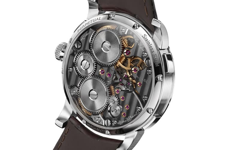 不锈钢材质/手动上链机芯/偏心时、偏心分、日期、星期、月份、逆跳闰年显示/万年历功能/动力储存显示/蓝宝石水晶镜面、透明底盖/防水30米/表径44mm/参考价:NT$ 6,100,000