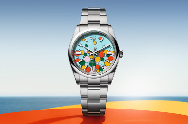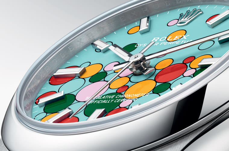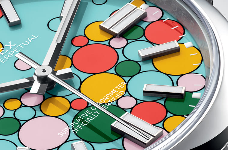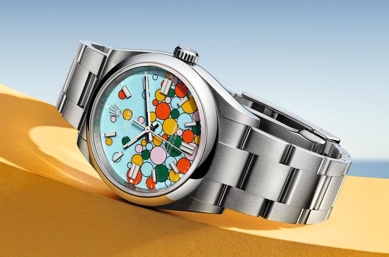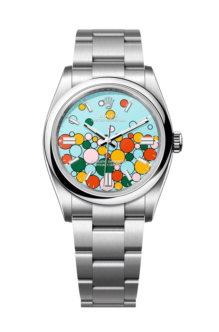 ROLEX劳力士在2020年~2022年旋风式地刮起了一阵Oyster Perpetual热潮,因为品牌在这个入门而且之前又比较冷门的系列中引进了彩色漆面设计,有点要向1970年代Datejust和Day-Date的Stella彩色面盘致敬的味道,结果这个无心插柳的新设计大大改变了整个OP系列的命运让它一夕爆红,不过品牌却是见好就收,彩色漆面的Oyster Perpetual上市不过三年就逐渐减少各尺寸不同顏色的款式。想不到劳力士2023年又无预警发表同样拥有漆面设计的新款OP,这次是在面盘同时放上之前彩色漆面OP出现过的五种顏色,看起来犹如面盘冒出彩色气泡般,带来青出于蓝的炫目视觉效果。