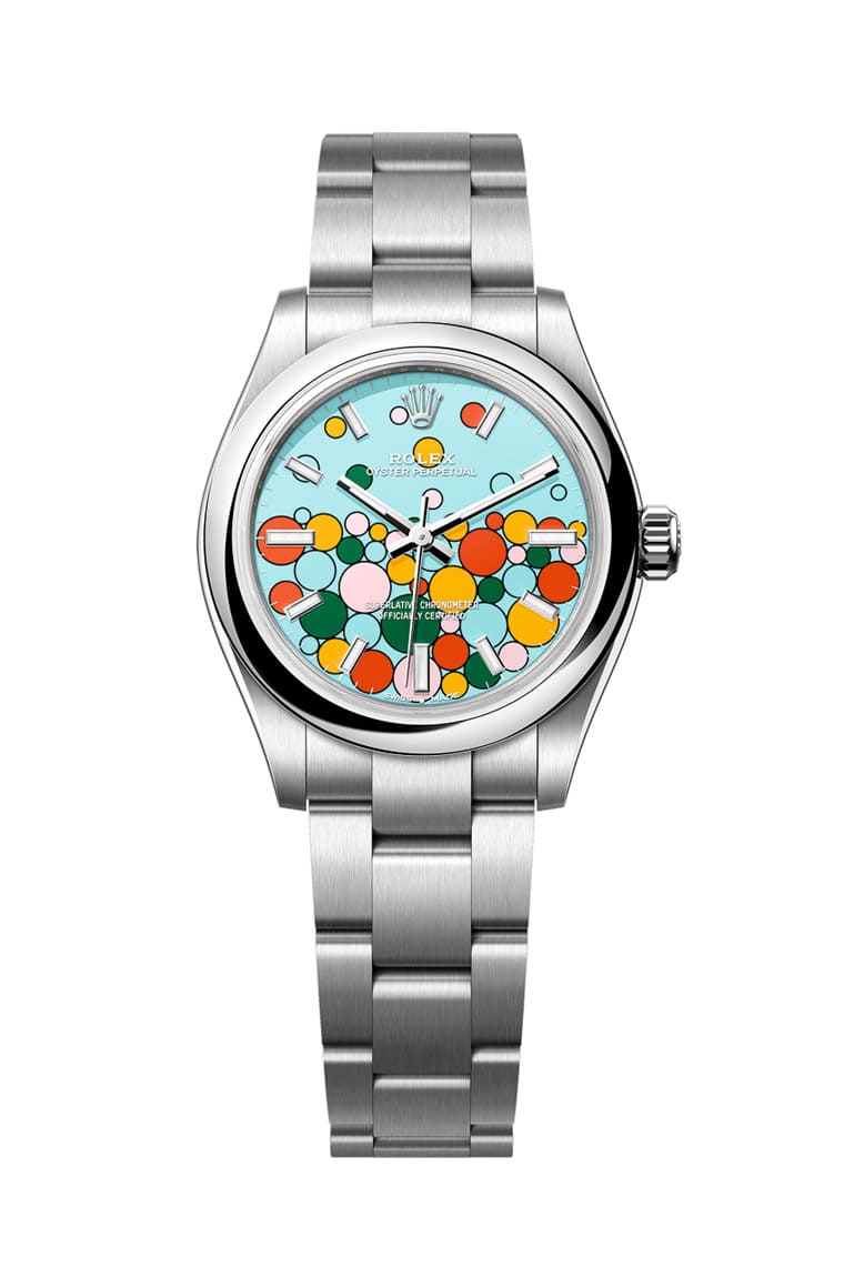 ▲拥有彩色气泡「庆典」面盘的Oyster Perpetual分别有31mm、36mm与41mm等三种尺寸。