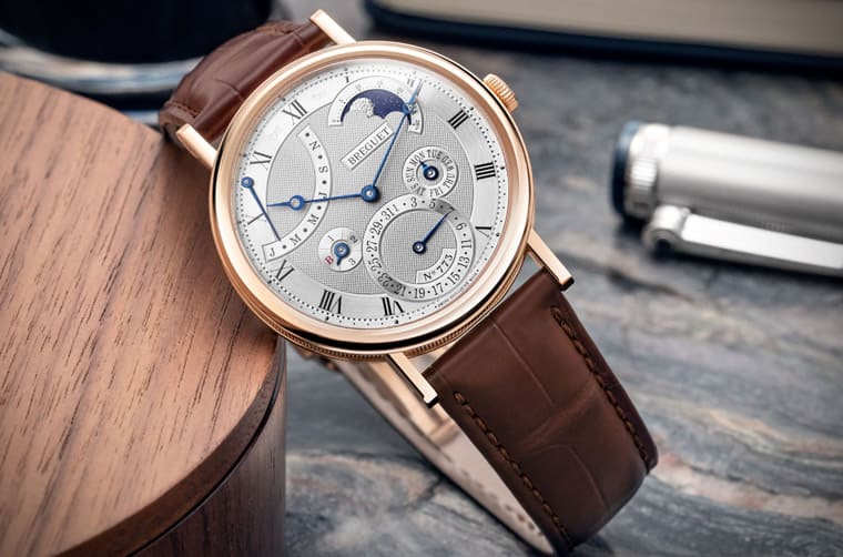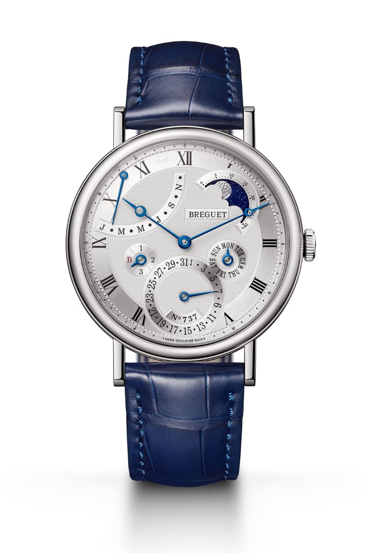 Classique 7327万年历分别有白金和玫瑰金版本,前者搭配深蓝色鱷鱼皮表带,后者则是换上与玫瑰金温润色调相称的棕色鱷鱼皮表带。表壳尺寸设定为39mm,以今日的正装表标准而言刚刚好,表侧不可或缺的元素是宝璣着名的钱币纹,而从表侧「埋藏」的多枚隐藏式调校按把,可以预先窥见手表蕴含的日历资讯相当丰富,因此才需要有多种快调机制,在手表需要调校时可以快速便利的完成作业。
