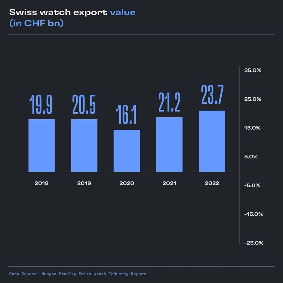 综观2022年整年,瑞士钟表的出口额持续冲高到237亿瑞郎,不仅比2021年成长11.6%,再度写下历史新高,这也代表2022年瑞士钟表的出口额比起疫情前的水准不减反增,以2018年~2019年为例,这两年瑞士钟表的出口额分别是199亿瑞郎以及205亿瑞郎,突显钟表市场整体的热度明显比疫情时代回温。