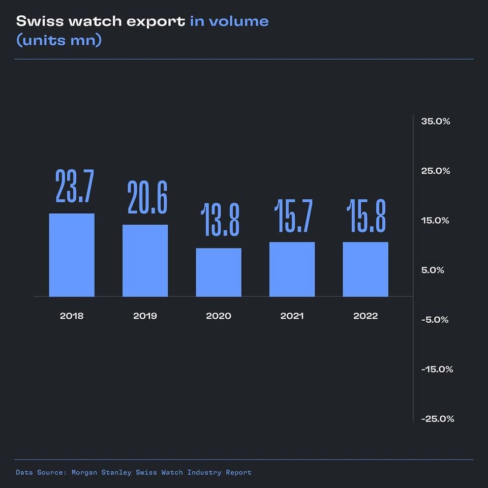 瑞士钟表产业的出口量在疫情肆虐严重的2020年一度写下1380万只的历史新低,虽然在2021~2022年两年有稍微增长,但成长幅度还是远远赶不上疫情前的水准,例如2022年瑞士钟表产业的年度出口量为1580万只,其实也只比2021年增加了49000只而已,比起2019年约2060万只的年产量下滑不少,如果把参考标准拉回到2000年时,当时瑞士钟表产业一年可以做出3000万只表,等于20多年后的现在直接腰斩了一半。