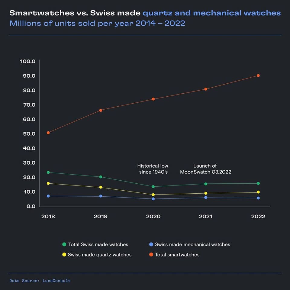 帐面上看2022年瑞士钟表产业出口量比2021年多一点,但别忘了2022年有个异军突起的明星石英表——MoonSwatch,假如这个产品没有问世并在全球热卖,等于2022年瑞士钟表产业的出口量有可能反而比2021年缩水(根据估计,MoonSwatch 2021年的出口量高达950000只,如果把这个数字吐回去的,2022年瑞士钟表产业的出口量应该会变负成长)。大摩和LuxeConsult把瑞士钟表产业出口量下降的主要原因归结为智能表大行其道,使得入门级距的瑞士手表面临了生死存亡的关头。