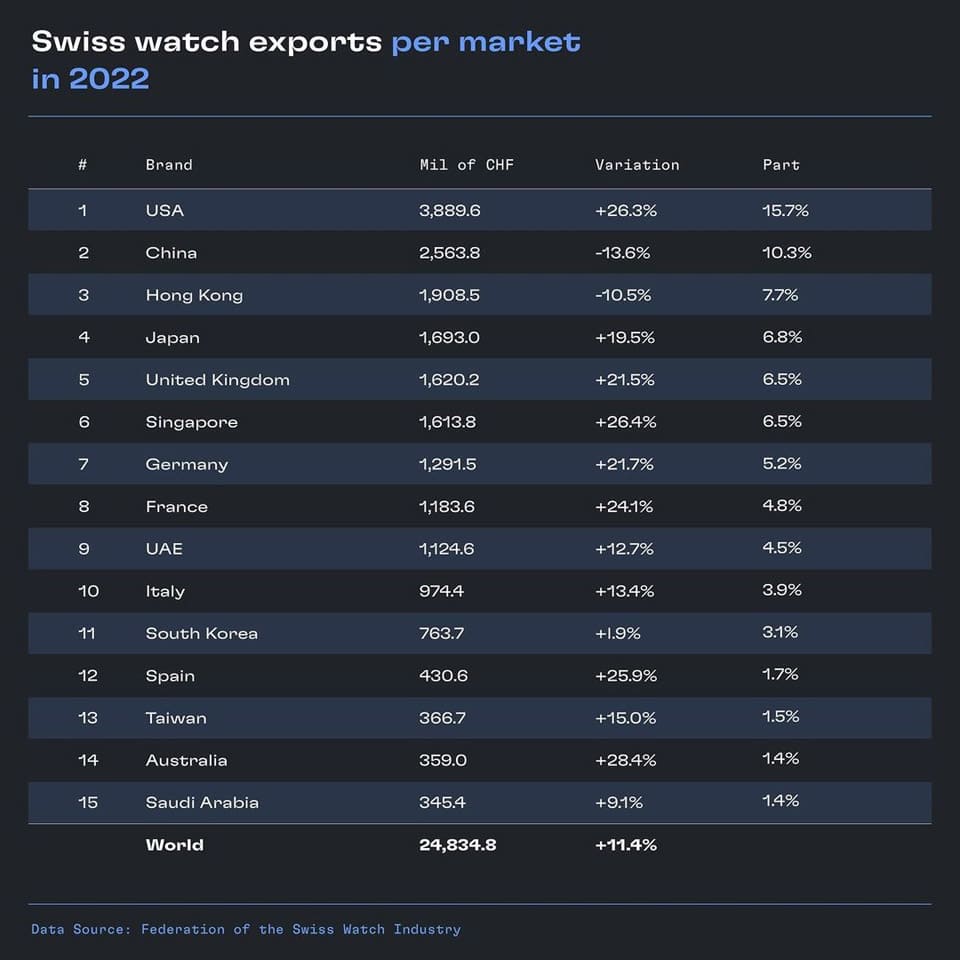 而在瑞士钟表产业出口的主要市场部分,2022年以出口额排名,前五名分别是美国、中国、香港、日本与英国,这五大市场的出口额都在16亿瑞郎以上,美国更是超过38瑞郎,佔瑞士钟表产业整体出口额的15.7%之多。前五大市场中包含中国与香港市场2022年的出口额都比2021年对退,即使如此,这两地市场佔瑞士钟表产业的比例还是有10.3%与7.7%之多,仍旧是瑞士钟表输出的主要大国/市场。台湾方面其实也有进榜,本地市场2022年替瑞士钟表贡献了3.6亿多的出口额,在全球市场中排名第13,佔比甚至还比澳洲和沙乌地阿拉伯要高。