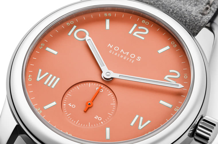 新款Club Campus分别有38.5mm和36mm两种尺寸,前者表壳厚度8.5mm,后者则是8.2mm,都属于同类型手表中相对纤薄的水准。NOMOS替手表统一配置灰色绒面皮革表带,因此最能区隔手表的特徵便是面盘的顏色,新款拥有珊瑚色和电光绿漆面两种配色可选,搭配红色的小秒盘指针散发青春热情,Superluminova夜光物料平时为白色,因此不论与珊瑚色或绿色搭配都有清楚对比感,而在黑暗环境中,时标与指针则会发出蓝色夜光。